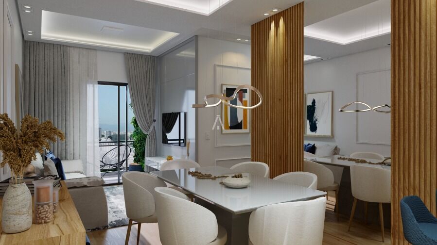 * Tipo 3 (1 suíte + 2 quartos): a versão maior, com suíte + dois quartos, área de estar/jantar/cozinha integrada, sacada com churrasqueira, e 2 vagas de garagem em muitos casos. Área privativa de 67,87 m².